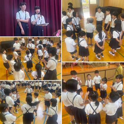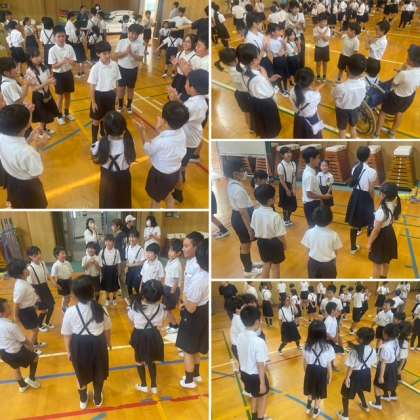 今朝の児童集会の様子です。今回のゲームは「リーダーをさがせ!」です。リーダーの動きを他の人が真似ていきます。オニになった人がリーダーがだれかを当てるゲームです。なかなか当たらないようにうまく真似ていくグループもありました。
