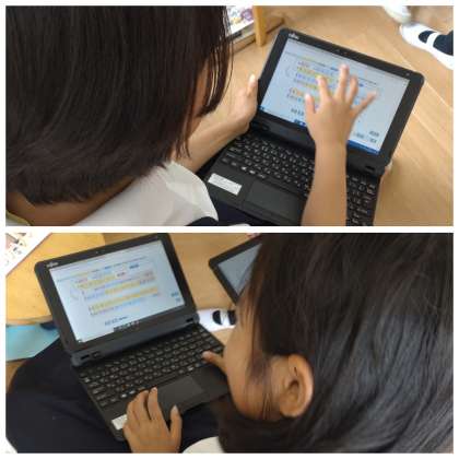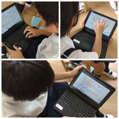 4年生の音楽では、音楽づくり「言葉でリズムアンサンブル」に取り組んでいます。4文字の言葉を使った3つのリズムを組み合わせて、音楽をつくっていきます。今回は、音楽のもとやしくみについて振り返り、どのように取り入れてつくるかを確かめ、一人一台端末でつくりました。同じ言葉を重ねたり、はじまりをずらして重ねたり、よびかけと答えを用いたりと、様々な工夫を取り入れた音楽ができていました。