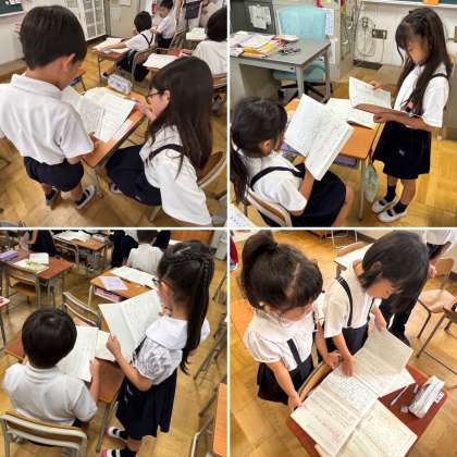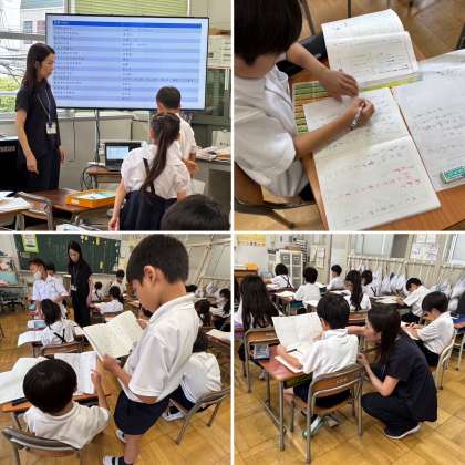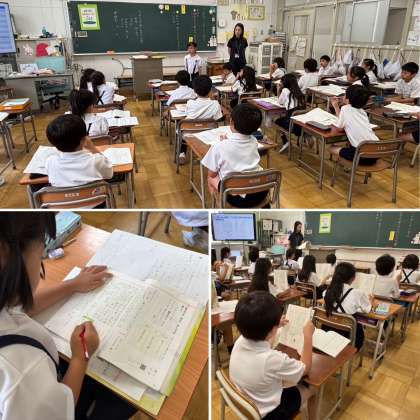 本校では「協働的な学びを通して互いに高め合う子どもを育てる」をテーマに授業研究会を実施しています。今回の授業は、2年生の国語「こんなことをしているよ」の学習でした。子どもたちは、自分の体験をもとにした作文づくりに取り組んでいます。この日は、事前に書いた「メモ」をもとに、文章の「はじめ・中・おわり」の「中(なか)」の部分を丁寧に書く学習を行いました。順序を表す言葉「まず」「つぎに」「それから」等を使って、出来事を分かりやすく書きました。子どもたちは、ペアやグループで自由にノートを見せ合いながら、「この言葉を入れるとどう?」「会話文を入れるとわかりやすいね!」と意見を伝え合っていました。その中で、互いの工夫に気づき、表現の幅を広げていく姿が見られました。
