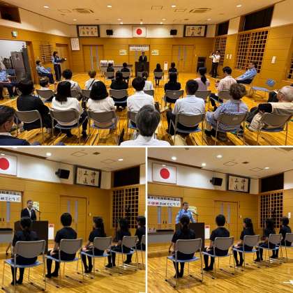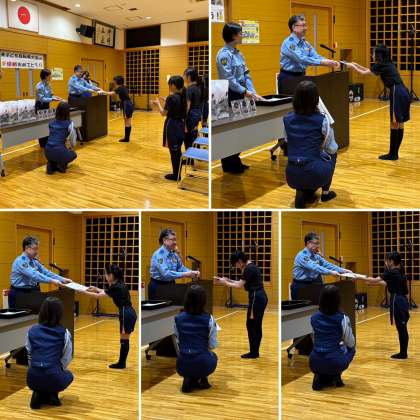 交通安全子ども自転車大阪府大会で見事優勝を果たした西天満小学校チームの表彰式が、天満警察署で盛大に行われました。北区長にたくさん褒めていただき、天満警察署長から表彰状を手渡された子どもたちは、達成感に満ちた誇らしげな表情を見せていました。