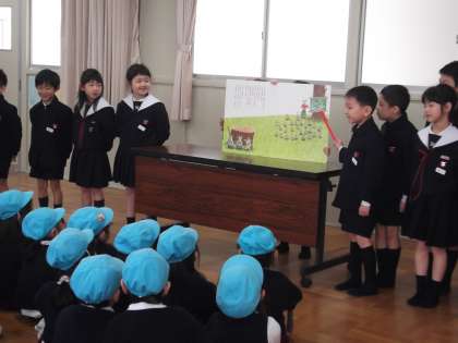 菅南幼稚園との交流会をしました。かわいい園児のお友だちを迎えるとあって、子どもたちも一生懸命にその準備に取り組みました。自分たちで考えた「好きなものクイズ」、セリフをしっかり覚えた紙芝居「にゃーご」、心を込めて作ったメダルのお土産・・・。 司会進行も、子どもたちが大きな声で元気よく進めていきました。みんなで「じゃんけん列車」を元気いっぱい楽しみ、にこにこ笑顔のあふれる会となりました。