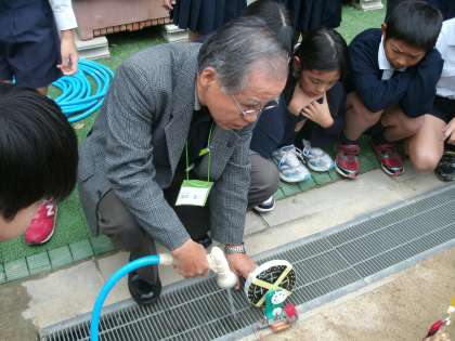 プロジェクタで砂の削られ方や、砂や石の流され方を学んだあと、外で実験を行いました。傾斜水路に砂を敷いて山の斜面に見立て、その上流からホースで水を流します。少しずつ砂が運ばれて、川ができる様子や、流れが変化する様子、下流にたまり三角州ができる様子などを観察しました。また、水力発電の仕組みや、燃料電池などの発展的な装置も演示していただき、子どもたちは興味深々でした。
