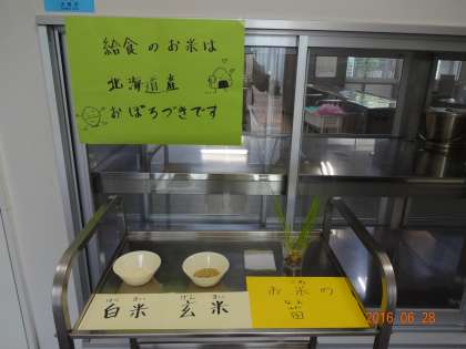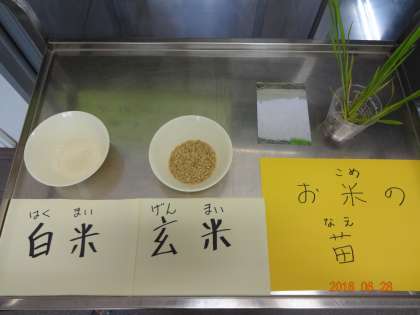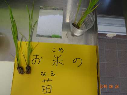 給食調理員さんの石橋さんが、お米の苗を持ってきて、給食室前に展示してくださいました。