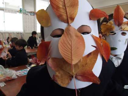教室に帰って、さっそく葉っぱを使って、お面つくりをしました。