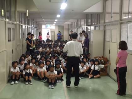 次に、津波に備えて4階の廊下に移動しました。狭い廊下に200人の児童が整然と集まり、校長先生の話を聞くことができました。