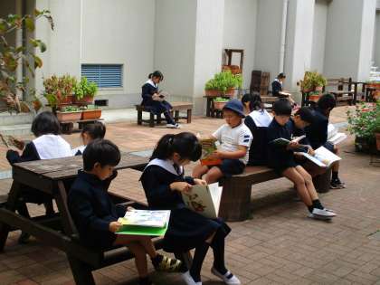 今日から「青空読書」が始まりました。昼休みに図書委員会の子どもたちが図書館から本を中庭に運び、「青空読書」の始まりです。