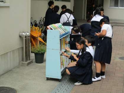 図書館に新しく入った本を運んでいるので、「青空読書」にやって来た子どもたちは、どの本から読もうかと悩みながら、本を選んでいました。