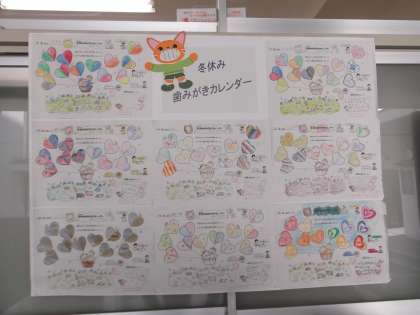 冬休みの「歯みがきカレンダー」です。みなさん、大みそかやお正月の間も一生懸命歯みがきをしていました。感想として、「忘れそうになったけど、思い出して朝晩しました。」「歯がツルツルになって気持ちが良かったです。」「これからも毎日続けます」と書いてありました。