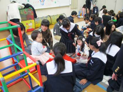 たくさん来られた乳幼児とそのお母さんたち、ボランティアの方々と遊具を使って、一緒に遊びました。初めは、赤ちゃんにどう触れ合ったらよいかと戸惑っていた子ども、どんどん赤ちゃんに声をかけて一緒に遊ぶ子どもなど様々でしたが、とても和やかな時間が流れました。