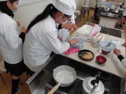 調理実習で、白玉だんごを作りました。水の量の調節に苦労していた班もありましたが、最後はどの班もおいしい白玉だんごを作ることができました。これで5年生での調理実習は最後になりましたが、友だちと協力しながら行った調理実習は子どもたちにとってとても楽しい時間になりました。