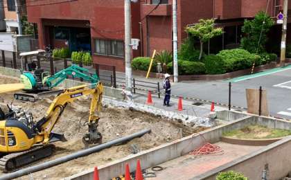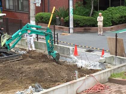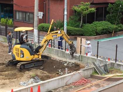 正門横の柵が取り払い、重機の搬入口を作っています