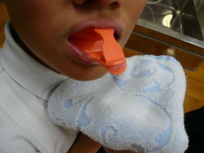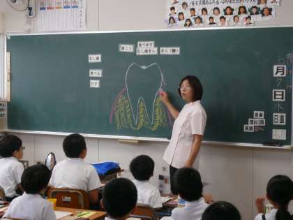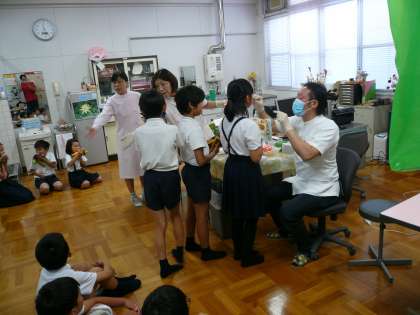大阪市教育委員会の歯科衛生士の方がこられて詳しく歯磨き指導を行ってくださいました。
