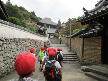 当日は残念ながら、曇り、昼前から雨が降り出すという天気でしたが、調べたことを自分の目で確かめたり感じたりできて、とても楽しかったようです。写真は正倉院と二月堂を見学している様子です。友達と一緒に食べたお弁当やおやつもいい思い出になりました。