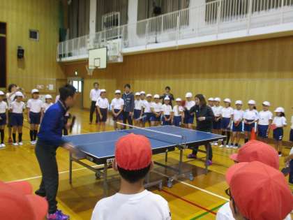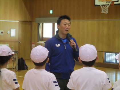 アテネ五輪に卓球シングルス、ダブルスの日本代表で出場された新井周さんに講師としてお越しいただいて、講演と実技指導をしていただきました。
