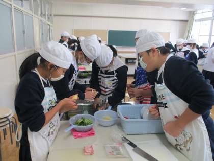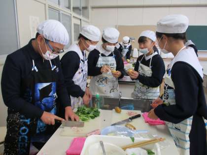 ジャガイモの大きさをそろえて切ること、小松菜の茎の部分とベーコンから炒めるなど調理のポイントを班の友だちと確認しながら楽しく調理することができました。