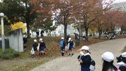 1・2年生で秋見つけに扇町公園に出かけました。サクラやイチョウ、カエデの落ち葉やドングリなど、秋の自然の贈り物を一生懸命見つけていました。「いろんな色が一枚の葉の中にある」「おもしろい形の落ち葉があったよ」と葉っぱ一枚にも心が動かされる様子です。この後、学校に帰って、1年生は落ち葉を使っておめんづくり、2年生は落ち葉のこすり出しをしました。秋を楽しんだ1日でした。
