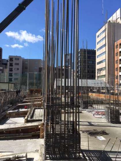 二階までのコンクリート打設が終わり、鉄筋が三階部分に向けて伸びて来ました。
