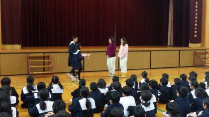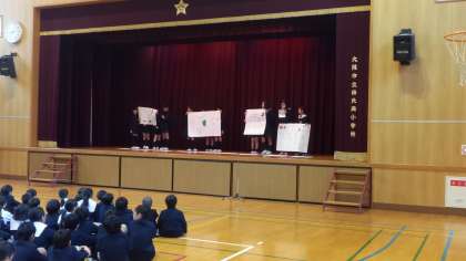 本日の集会は、給食調理員さんへの感謝のお手紙贈呈式と飼育栽培委員による発表でした。