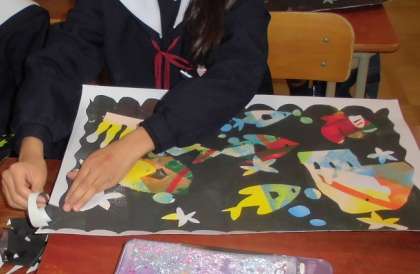 3学期になって、ずっと取り組んできたローラー版画がようやく完成しました。インクで真っ黒になった画用紙から、どんな模様が出てくるのかわくわくしながらシールをはがしました。すると…。魚や花、星、虫など、きれいな模様がどんどん現れて、「きれい!」「成功や!」とうれしそうな声があちらこちらから聞こえてきました。早速掲示せいて、お互いの作品を鑑賞しあいました。
