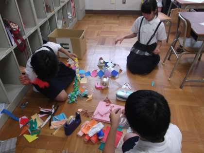 今日は、7月5日(月)に行われる夏の全校活動(たなばた集会)の準備がありました。6年生が中心となって短冊や笹飾りを班で協力して作りました。