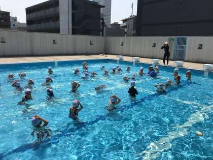 プール学習の時の注意点を確認した後、屋上のプールへ。プールに入るなり、みんな大喜び!今日はとっても良い天気だったので、気持ちよく入ることができました。水のかけあいや、追いかけっこなどの水慣れも楽しんで行うことができました。
