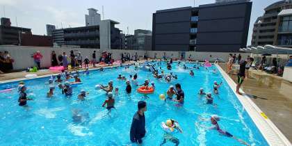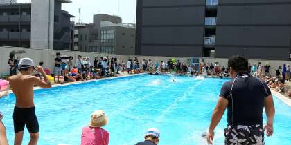 都会のオアシス、西天満小学校の屋上プールで、PTA主催の「わいわいプール」を行いました。