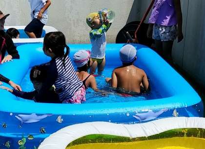 自由遊びだけでなくゲーム大会やリレー大会もあって大盛り上がり。大人の方がはしゃいでいる場面もたくさん目にすることができました。プールサイドのミニプールでは就学前の小さな子どもたちも楽しく遊ぶことができました。