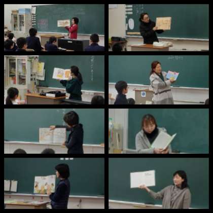 毎月第一木曜日の始業前に全教室に入って一斉に読んでいただいています。「子どもたちにどんな本を読んであげようかな」と絵本の情報を集め、子どもたちの興味がわきそうな本を選んでいただいています。子どもたちは楽しみにしており、いつも真剣に聞き入っています。