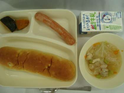 「ウインナーのケチャップソース スープ(個別対応給食:枝豆) 焼きかぼちゃ おさつパン 牛乳」