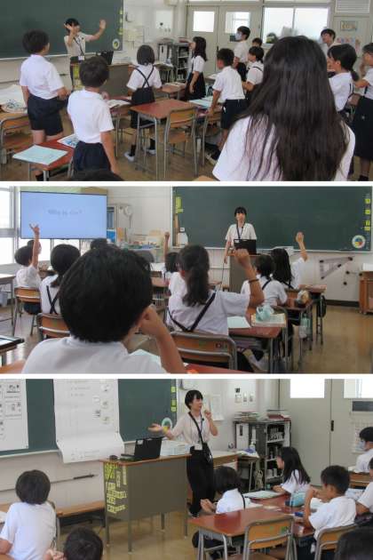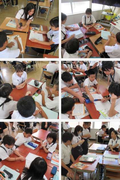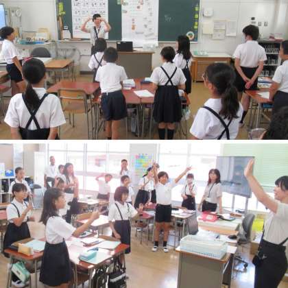 本校では「協働的な学びを通して互いに高め合う子どもを育てる」をテーマに授業研究会を実施しています。今回は、5年生の外国語の学習です。「can」「can't」(「できること」「できないこと」)の言い方を学び、「この先生はだれ?オリジナルチャンツクイズづくり」に取り組みました。ある先生の「can」「can't」が書かれたプリントを班ごとに1枚受け取り、どの内容をクイズに取り入れるのかを話し合いながら決めていきました。選んだ内容の英単語をプリントに書き、チャンツの発音練習をしたり、聞いている人に伝わるような身振りを考えたりと、お互いに考えを伝え合いながらオリジナルのチャンツクイズをつくっていきました。