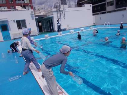 先々週、5・6年生がプール納めとして、普段着を着たまま泳ぐ「着衣水泳」の学習を行いました。服を着たまま歩いたり泳いだりする際の抵抗を体感したあと、ペットボトルやポリ袋を利用して、身体を浮かせる練習をしました。自らの命を守るための大切な学習に、一人一人が真剣に取り組んでいました。