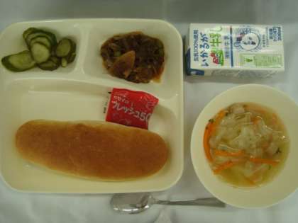「牛肉のデミグラスソース煮 ウインナーのスープ きゅうりのピクルス パン いちごジャム 牛乳」