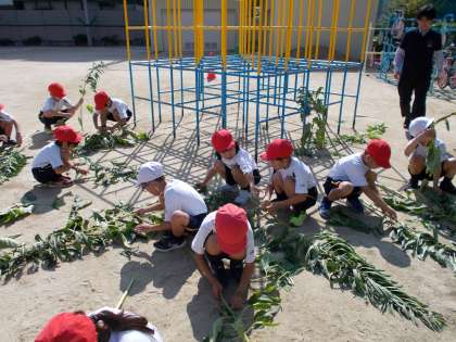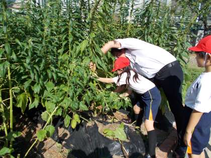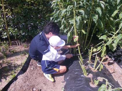 6月に種をまき、和田萬の方に教えてもらいながら世話を続けてきました。この夏の暑さで枯れないか心配していましたが、元気に成長し、高いものはジャングルジムと同じくらいの丈になりました。