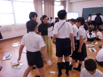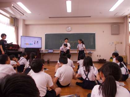 5年生の外国語の時間です。子どもたちがグループに分かれて創作したChants(チャンツ)の発表会を、い組・ろ組合同で行いました。Chantsとは、リズムに合わせて英語のフレーズを発音する活動です。みんなの前での発表はとても緊張していましたが、どのグループも笑顔にあふれていて、楽しそうに活動することができました。