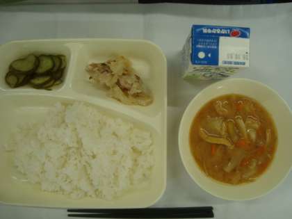 「鶏肉の塩こうじ焼き さつまいものみそ汁 きゅうりの甘酢あえ ごはん 牛乳」