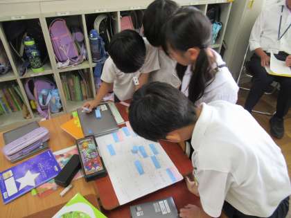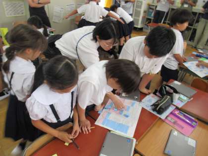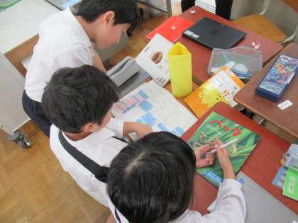 本校では「協動的な学びを通して互いに高めあう子どもを育てる」をテーマに授業研究会を実施しています。今回の授業は、3年生の理科の学習でした。「こん虫マスターになろう」を単元のめあてとし、3年生オリジナルの昆虫図鑑を作り、図書館に置いてもらうことを目標としています。1・2年生にとってわかりやすくて、高学年にとって読んで面白い図鑑になることを意識しています。班で一つの昆虫について調べ、他の班にアドバイスをもらったり、参考になった点を伝え合ったりして、それぞれの学びを深めました。