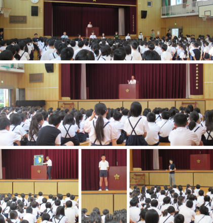 月曜日は全校朝会です。校長先生からは、秋分の日以降は昼の時間が短くなって夜の時間が長くなっていき、12月の冬至で昼の時間が一番短くなるというお話がありました。日が暮れるのが早くなるので、外で過ごすときには気を付けましょうというお話しに、子どもたちはしっかりとうなずいて聞くことができていました。また、体験入学の児童の紹介もあり、英語を交えた子どもによる挨拶にあたたかい拍手が送られました。最後に、司会の先生からは今月の生活目標「物を大切にしよう」について、休み時間にみんなで使う道具の整理は次の人のことを考えるように意識しましょうというお話がありました。