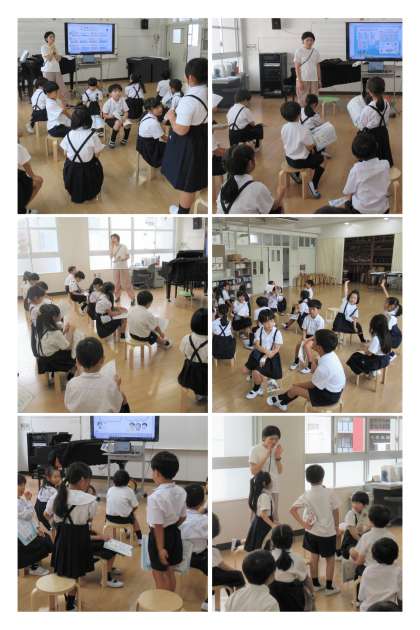 1年生の音楽の時間です。二つのグループに分かれて、同じフレーズを繰り返して歌う「やまびこごっこ」の学習を行いました。本物のやまびこを聞いたことのある児童が、その時の様子を楽しそうに語ってくれました。