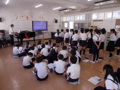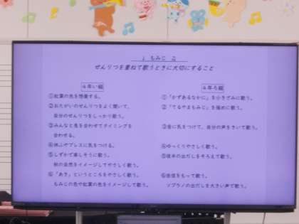 4年生の音楽の時間です。先日の6年生との合同授業を通して学んだそれぞれのグループが意識することを、い組とろ組で共有しました。共有したあとに、それぞれのパートに分かれて合唱しました。始めの音や低い音など、それぞれが意識しながら練習を重ねることで、さわやかな歌声が音楽室を包み込むようになりました。来週には、成長した様子を6年生に聴いてもらう予定です。
