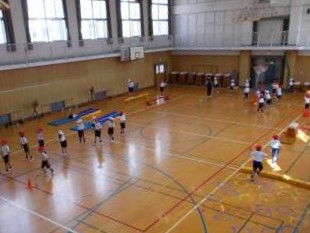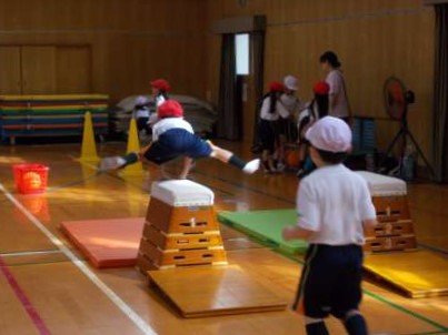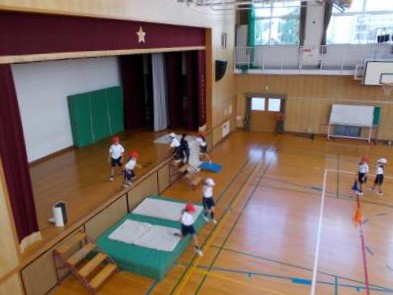 1年生の体育の時間です。マットや跳び箱、平均台、ボールなどの用具を使って、今までに学習した動きを取り入れたさまざまな運動にチャレンジしました。汗だくになりながらも、みんなとても楽しみながらたくさん体を動かしていました。