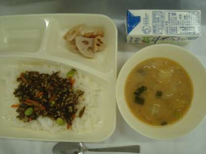 「もずくと豚ひき肉のジューシー(除去食:大豆) じゃがいものみそ汁 焼きれんこん ごはん 牛乳」