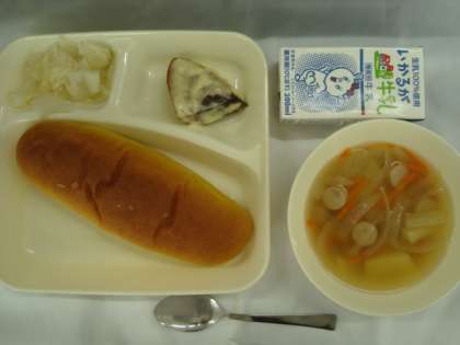 「かつおのガーリックソースかけ ウインナーとじゃがいものスープ キャベツのサラダ パンプキンパン 牛乳」