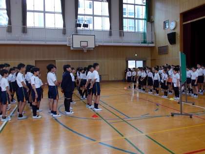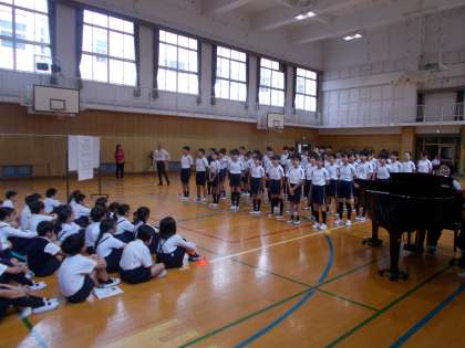 朝のステップアップタイムに、4年生と6年生でミニコンサートを開きました。4年生は、先月6年生とともに学習した「もみじ」を合唱しました。ソプラノとアルトのパートに分かれて、旋律の重なりを意識することができました。6年生は、「翼をください」を合唱しました。講堂全体に美しい歌声が広がり、4年生の心を大きく動かしました。最後に、全員で向かい合って「もみじ」を合唱しました。100人近くの子どもたちの歌声が講堂中に響き渡り、さわやかな秋風が講堂に吹きました。今回の経験をこれからの学習に活かしていってほしいと思います。