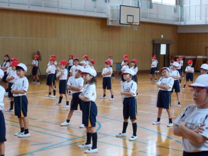 1・2年生は「はいよろこんで」と「ビターバカンス」の2曲のダンスを練習中です。どちらも、とんだりはねたりの元気いっぱいのダンスです。1年生は、初めての運動会に向けてはりきって練習しています。2年生は、1年生のお手本となるよう、とても大きな動きで上手に踊っています。これから、入場や退場のダンスと合わせて、1・2年生の団体演技を仕上げていきます。