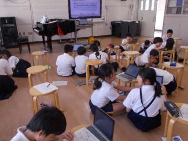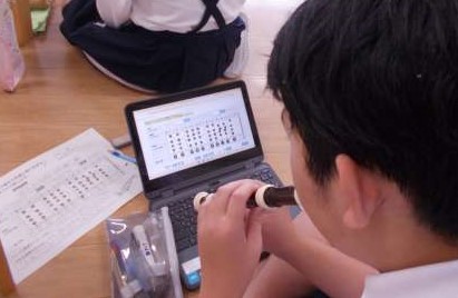 5年生の音楽では、和音のひびきの移り変わりを感じ取りながら旋律づくりをする学習に取り組んでいます。タブレット端末で、デジタルコンテンツを使い旋律をつくると、つくった旋律の音源をすぐに聞くことができます。子ども達は自分のもつイメージに合った旋律になるよう、旋律づくりに挑戦しています。「やさしくて楽しいイメージの旋律になるように、最初の音は高いド、最後は低いドにした。」や、「ぽかぽかあたたかくて気持ちいい日をイメージした旋律になるように、最後の音を高い音にした。あまり音の高さが変わらないようにした。」など、つくりたい旋律のイメージをもつことと、それを表現するためにどのような工夫をすればよいかを考えながら旋律づくりに取り組んでいます。一人ひとりのできあがった旋律を聴くのが楽しみです♪