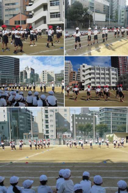1・2年生の団体演技の練習が進んでいます。運動場いっぱいに広がって、体を大きく使って、ダンスを楽しんでいます。1年生は、2年生の隊形のつくり方や広がり方のお手本を見ながら、一生懸命にがんばっています!