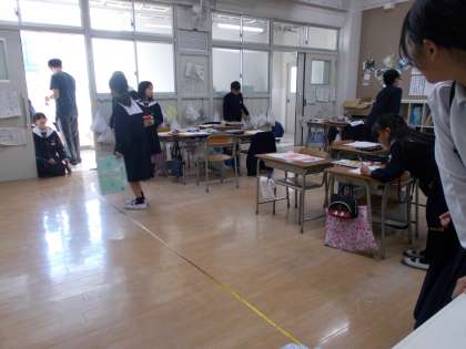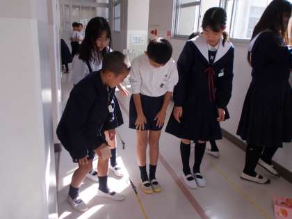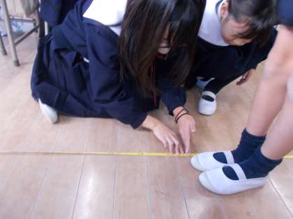 5年生は、算数で「平均とその利用」の学習をしています。自分の歩幅がわかれば「歩幅×歩数」で家から学校までの道のりを求められることに気づきました。歩幅はいつも同じとは限らないので、平均を使うことができます。10歩ずつ3回歩き、まず10歩の平均を求め、それを10で割れば、自分の歩幅が求められます。そこで、班で協力して一人一人の10歩の距離を測り、自分の歩幅を計算しました。歩幅がわかれば、いろいろなところの道のりを調べることができますね。