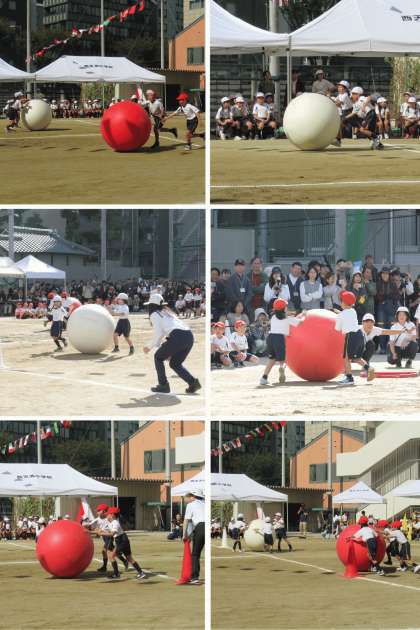 1・2年生の「大玉ころがし」です。大きな大きな玉をうまくコントロールしながら転がします。チームで上手に息を合わせて進めていきます。