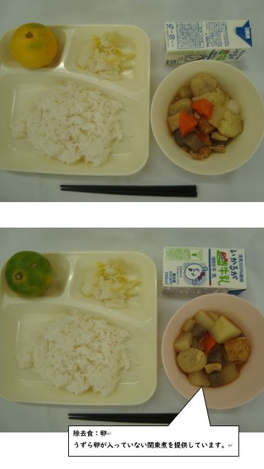 「関東煮 はくさいの甘酢あえ みかん ごはん 牛乳」