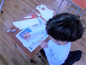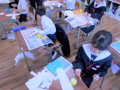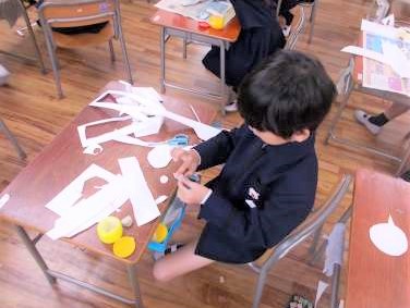 2年生の図画工作では、鳥の版画をつくっています。画用紙に、頭・口・体・羽などの体の箇所の絵を描いて、丁寧にはさみで切って貼り付けていきます。それぞれの個性が光る鳥がたくさん完成しました。大きな羽の鳥たちが、今にも空に向かって羽ばたいていきそうです。
